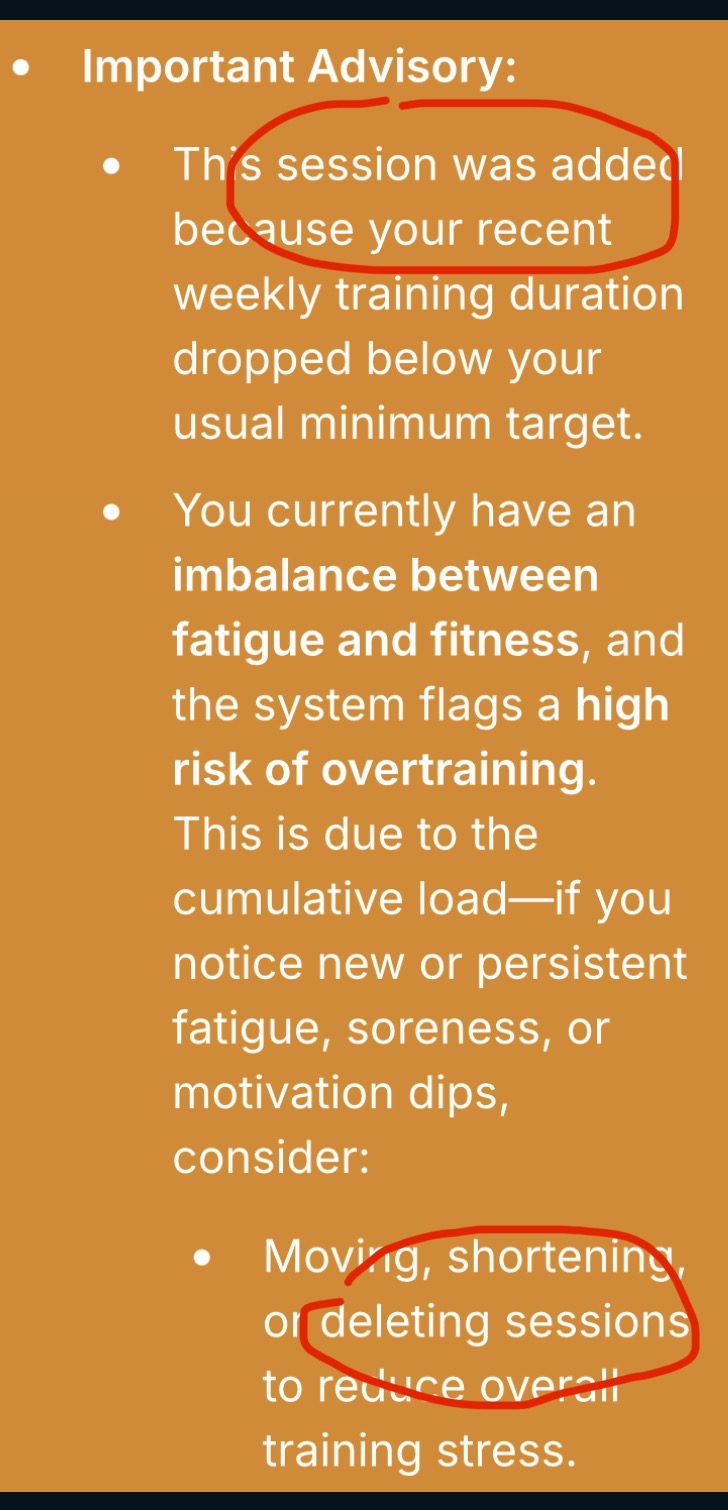So this morning I see today’s session duration was increased bc my recent load has decreased according to Al coach…and in the same message it warns me of a high risk of overtraining and advises me to move or delete sessions. Seriously?