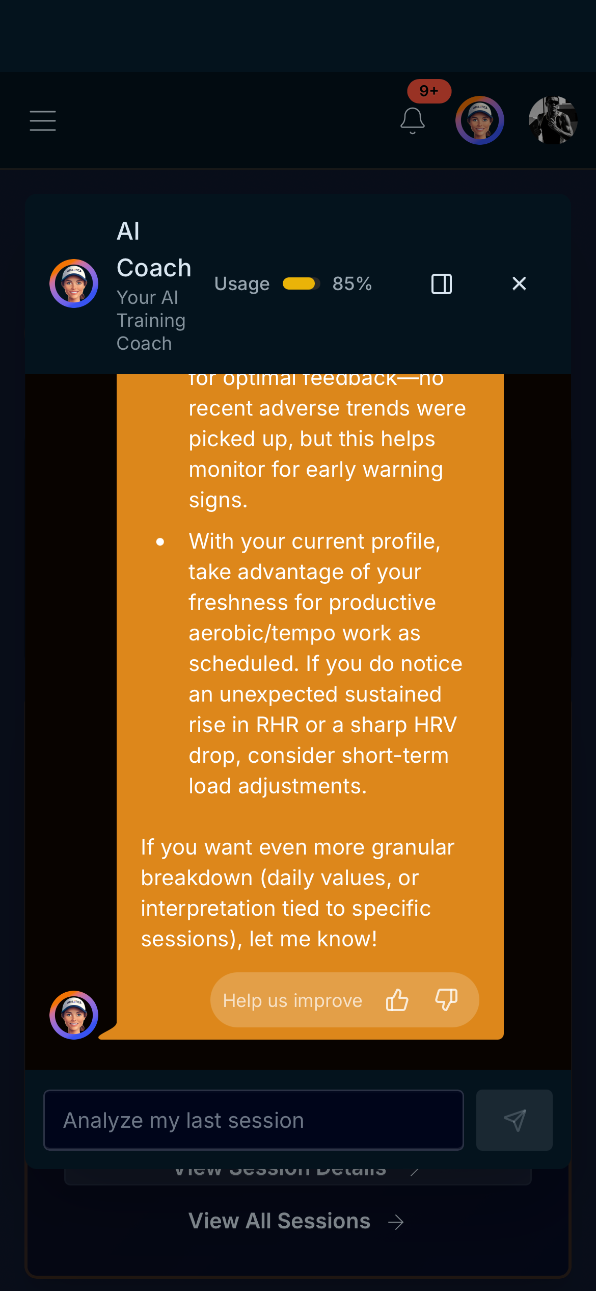Yesterday 82%. No questions and this morning I wake up at 85%. I like very much the ai coach utility but it’s usage is very limited and unclear at least to me.