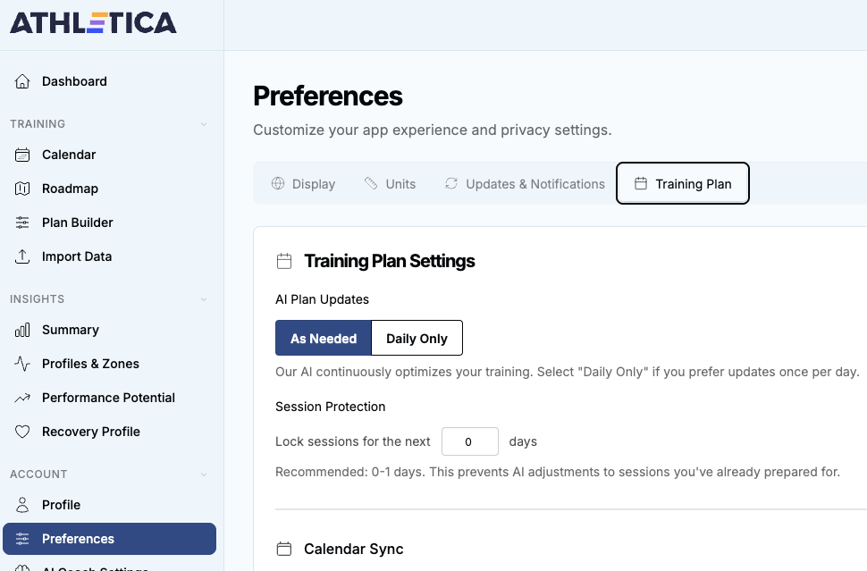 As Needed: Any changes to the plan, such as a workout, threshold change etc will trigger plan update. Session Protection: β0β will trigger same-day updates, which could mean changes to your session duration.