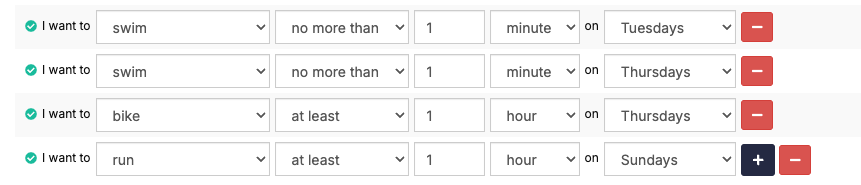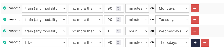 Thank you for your response! I just recently started and I would like to set specific user constraints - on Monday I only have 30 min I could train - while on Saturday I could train up to 2 hours and Sunday 3 hours. Other days I don’t want to exceed 60-80 minutes for now. Thanks a lot for your help!