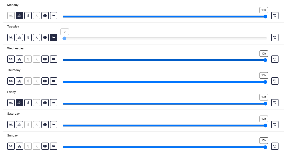 Admittedly, this interface is visually much nicer. Nevertheless, this version has removed an element that was very important to me in planning, i.e. the possibility of indicating a time limit per sport rather than per day.