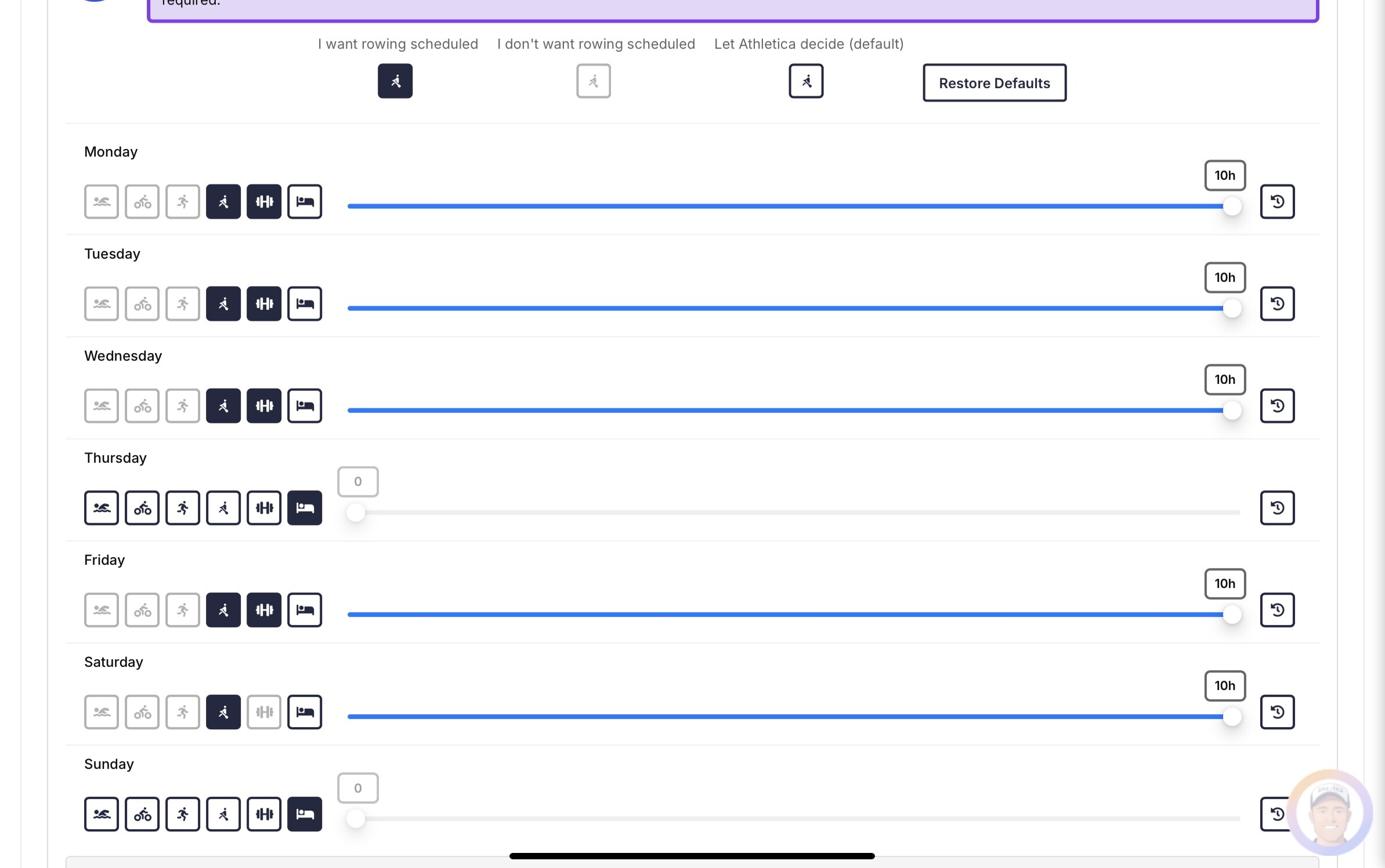 Edit: That promptly put me into high volume and ignored my set rest day (no other constraints set). I changed the slider down to Recreational and got no change other than the rest day showing up as intended. Finally, I set the time limits back to “let Athletica decide” and got no noticeable changes. I’m just trying to end up with Mid Volume and Wednesdays off.