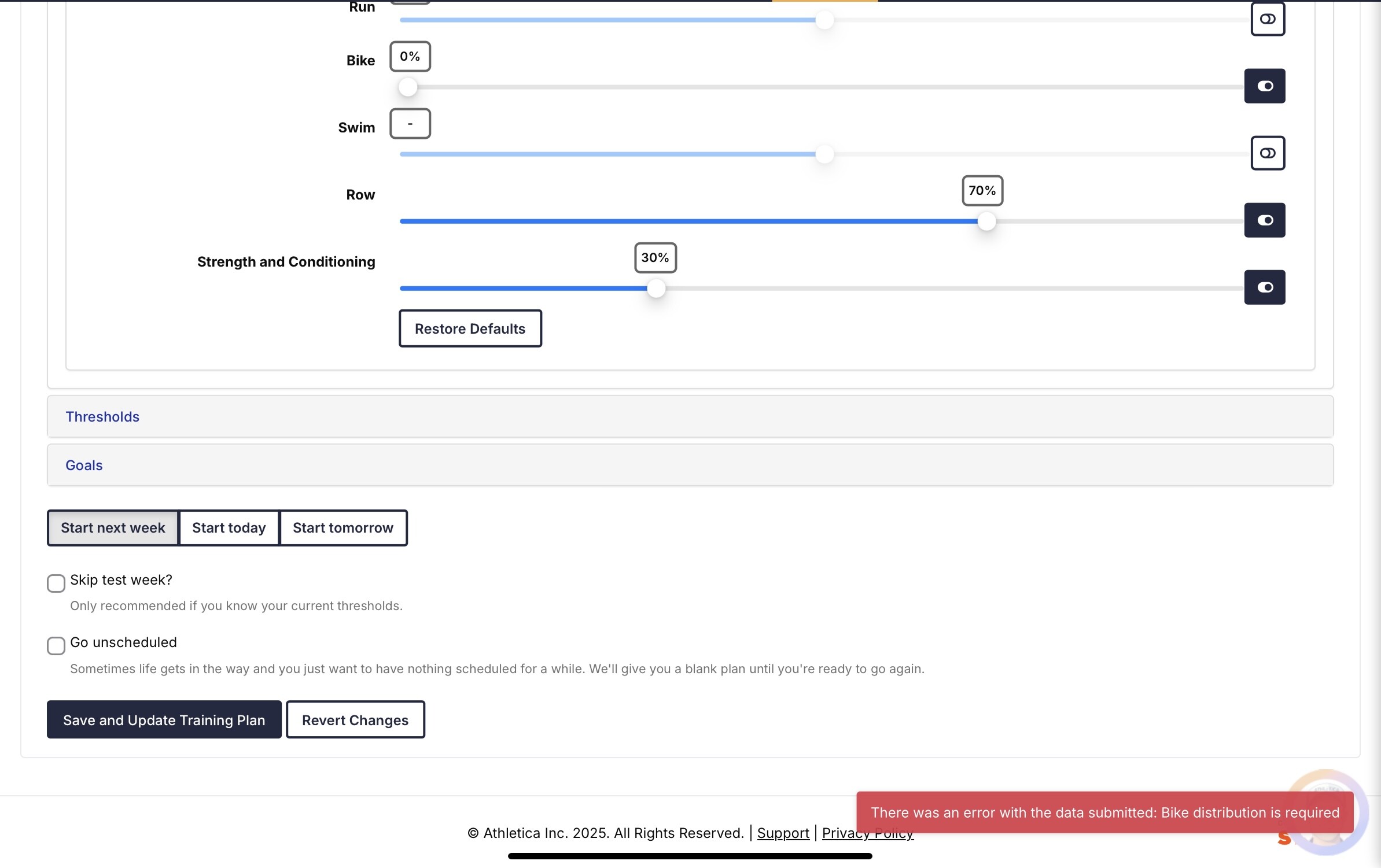 The system now requires that I select cycling in the distribution. I do not cycle. I can set everything else I don’t want to do to zero, but I have to set cycling to 1%. Ironically, it is now scheduling 3 hours of cycling workouts per week. Prior to the latest change, I was being scheduled for zero cycling workouts.