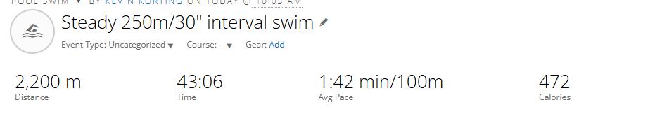- This week I had to move some of my prescribed swims around. I moved Mondays to the day before (the previous week). I moved Wednesday’s swim to Thursday. Because neither of the swims I completed on these days uploaded, athletica has prescribed 3 swims for me today, 1 of them @ 4500 metres