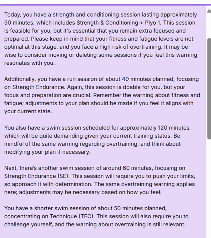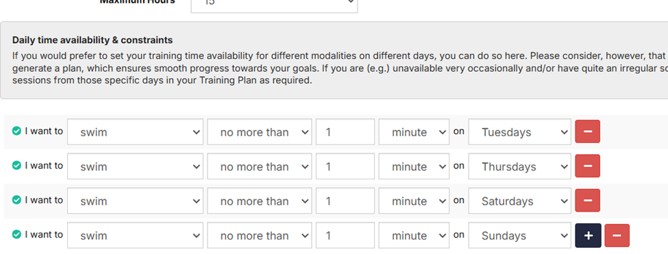 I’ve taken a snip of my AI coach’s summary of my day below. I have taken out most of the time constraints as they were causing issues, but I did leave the constraint to no more than 1 minute of swimming on 4 days of the week. Screen shot below. I can take out all of the constraints and just move my swims around if necessary. Any guidance on this is appreciated.