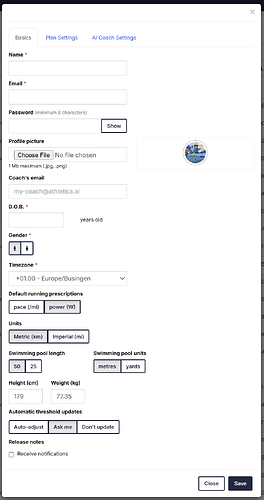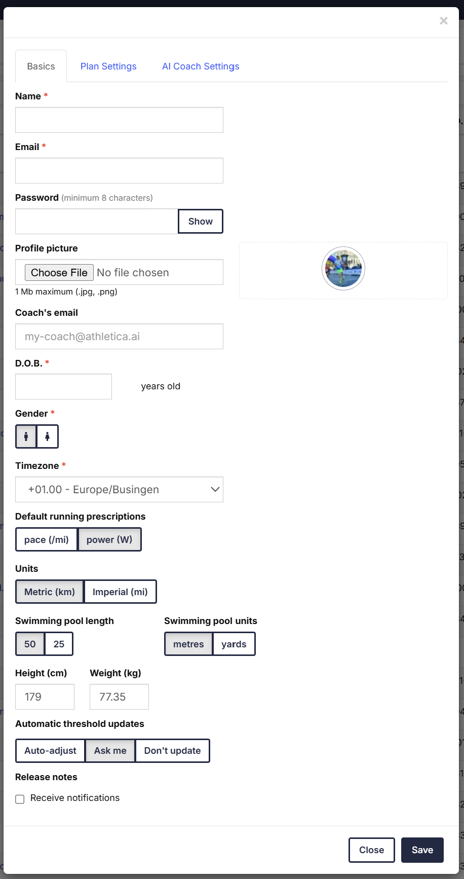 - Workout Prescription Mode: Select whether workouts are prescribed by pace, heart rate, power, or let Athletica’s AI decide.