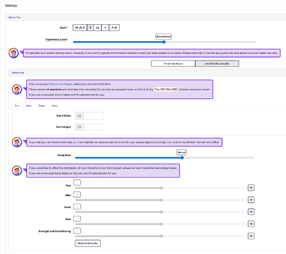 - Training Modality Distribution: Customize the proportion of running, biking, swimming, rowing, and strength training in your plan.