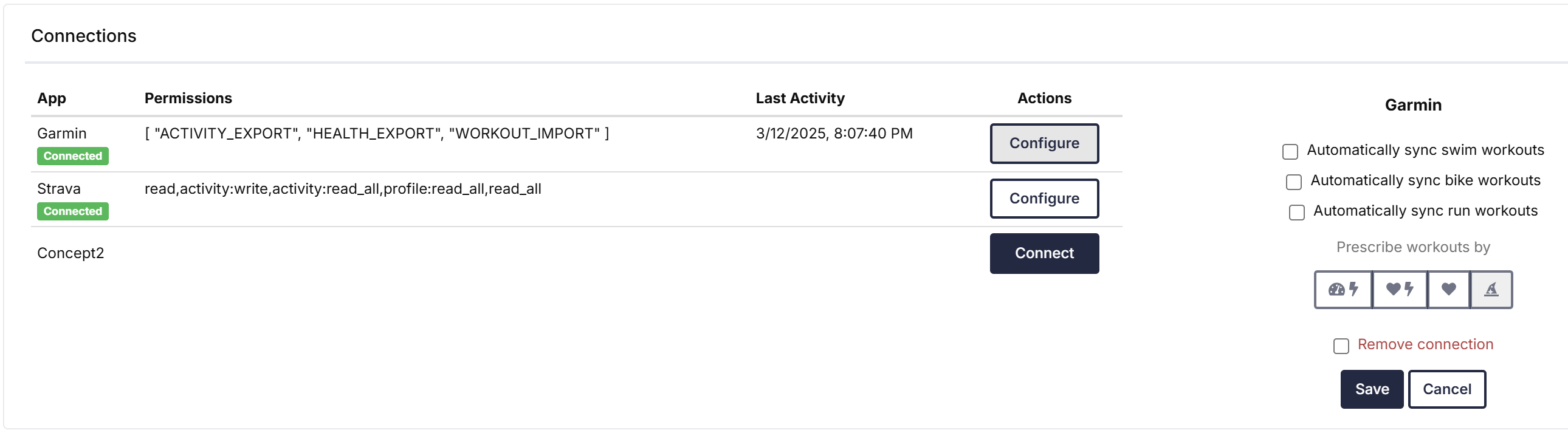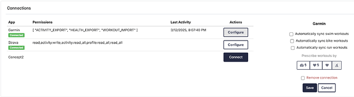 - Connected Apps: View linked accounts (e.g., Garmin, Strava, Concept2) and connect new accounts