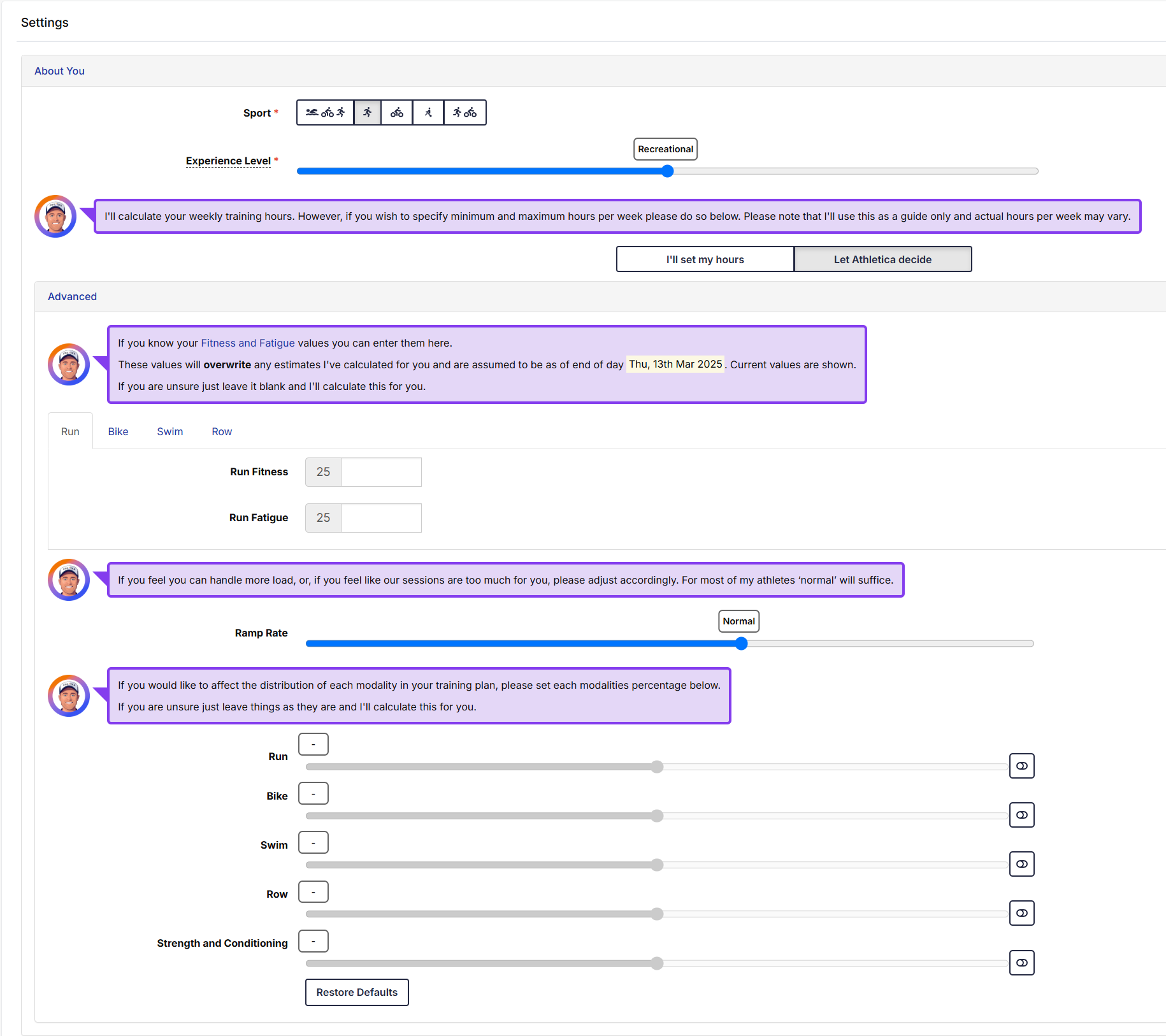 - Training Hours: Let Athletica decide based on your experience level or manually input your weekly available training hours.