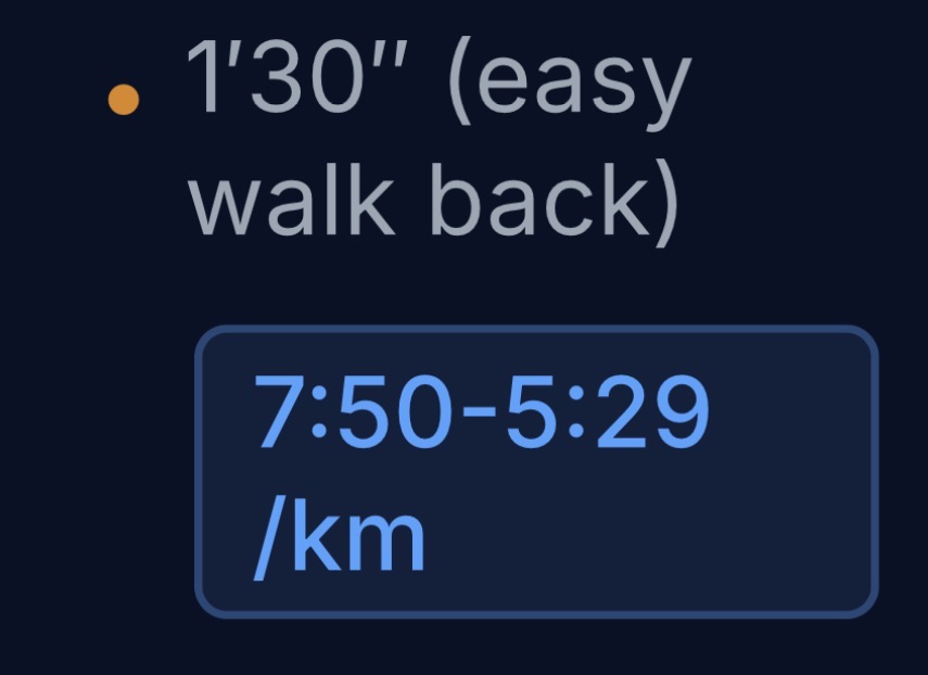 For the preceding short hill sprints the recoveries are “easy walk back” which is certainly not at the pace prescribed. In this case it seems clear to me that I should ignore this pace and just walk back easy, though target pace alerts in your watch are annoying (they can’t be disabled in Coros and the only option is to modify the workout)