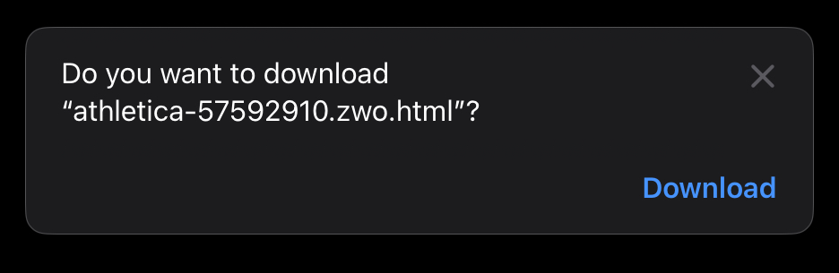 I download my structured workouts to get them into Zwift. This generally works fine, but there’s some weirdness around the file type when I download them from Athletica. All of them are ultimately being presented to my browser (mobile Safari) as “.html” files instead of “.zwo” or whatever I selected. I get around this by renaming the file locally and removing the extra “.html” extension but this seems like something that could be fixed with little effort.