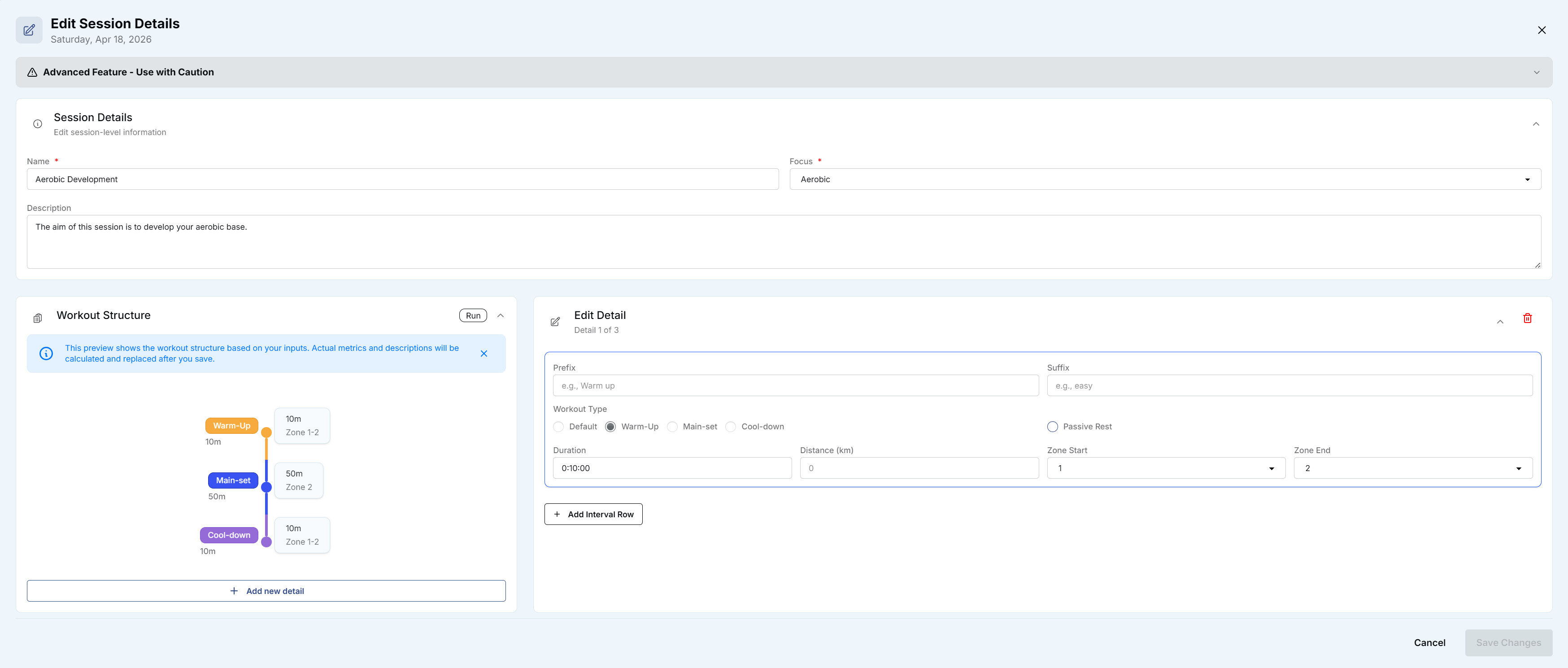 Hi - I am unable to figure out in the new UI how to edit the length of the main set of my workout: the edit panel defaults to the first detail (i.e. the warm up) and I cannot find how to swtich it to the next pat, which is what I want to edit (see the screenshot of what I see).