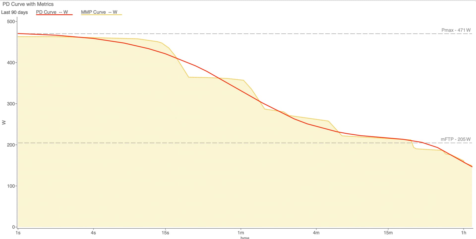 If you do a web search or ask AI to explain the difference between Critical Power and Threshold Power, you will find the former to be associated with 30-40 minute power and the latter with one-hour power. To complicate matters, CP is typically (mathematically) derived from “best efforts” ranging from 3-20 minutes. This means the CP curve sits atop the mean maximal power plot (asymptotic to the highest peaks/best efforts).