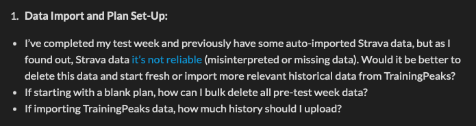 I’ve completed my test week and previously have some auto-imported Strava data, but as I found out, Strava data it’s not reliable (misinterpreted or missing data). Would it be better to delete this data and start fresh or import more relevant historical data from TrainingPeaks?