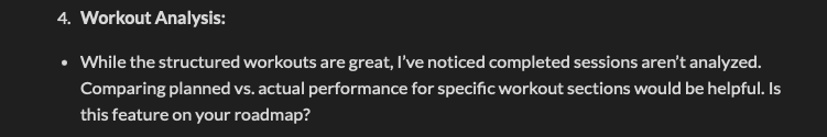While the structured workouts are great, I’ve noticed completed sessions aren’t analyzed. Comparing planned vs. actual performance for specific workout sections would be helpful. Is this feature on your roadmap?