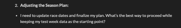 I need to update race dates and finalize my plan. What’s the best way to proceed while keeping my test week data as the starting point?