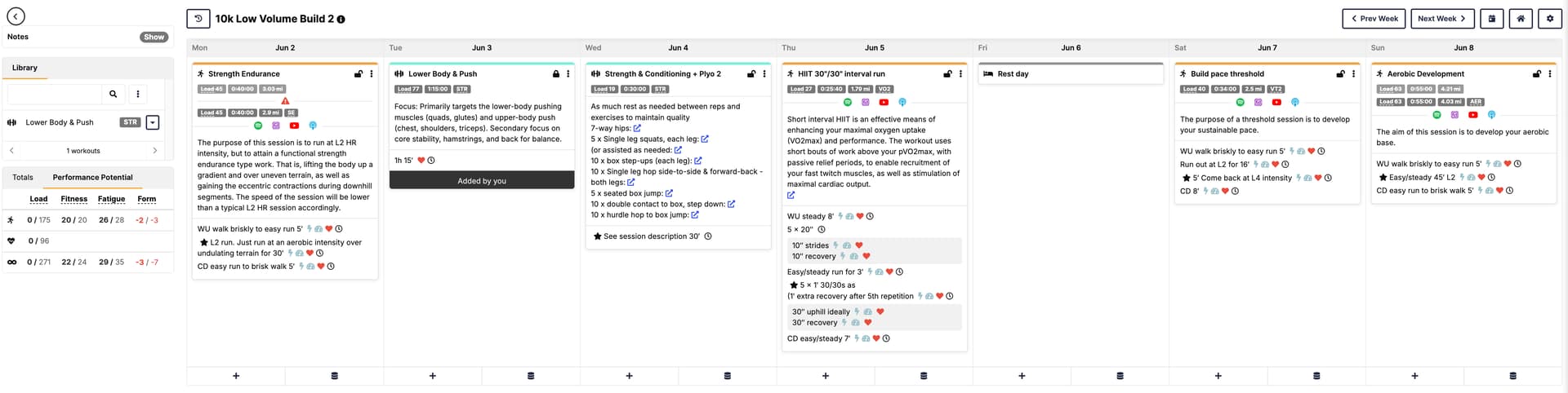 - Keep two fixed strength-training days each week (about 1 h 30 min). I design these workouts myself and have them saved in Garmin Workouts.