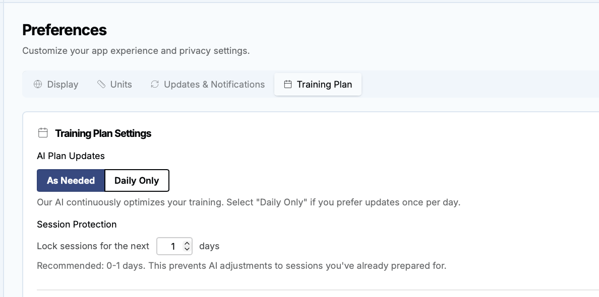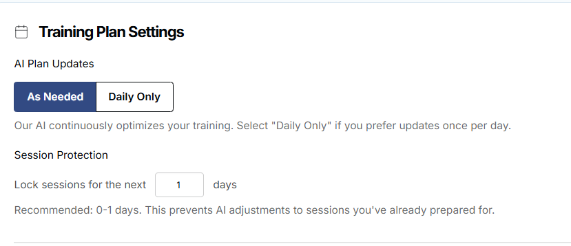 “As Needed” means plans are updated and adjusted any time there are workouts deleted, completed, moved, thresholds changed, etc etc. Most people do not need this, and choosing “Daily” would suffice.