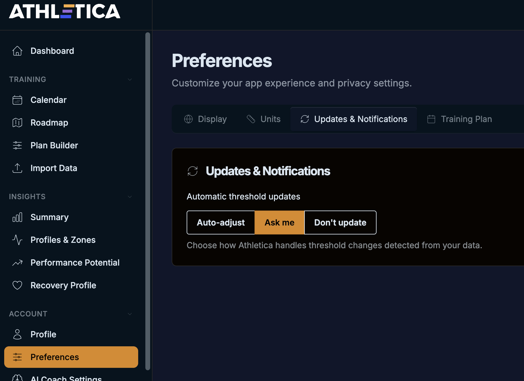 My preference, of course, would be for athletica to set my training so that my threshold improves and then adjust it dynamically.