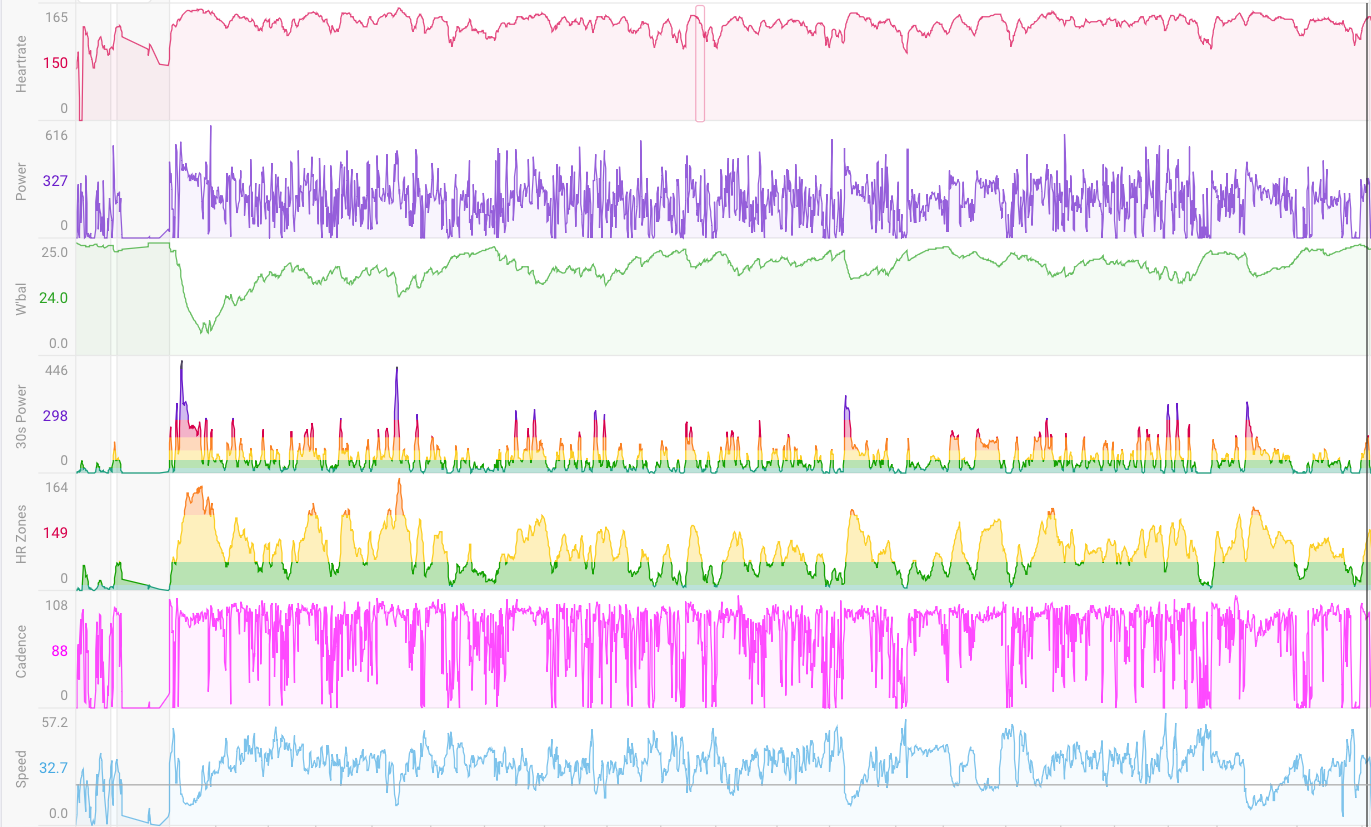 Related to that the one difference I see between road and gravel races are “unsteadiness” I.e., my gravel-race efforts never see steady effort, instead they go up and down all over the place all the time. Here’s a a recording of my last race first 100 km 1ith 1000 m of elevation (bike broke after 100 of planned 150 km):