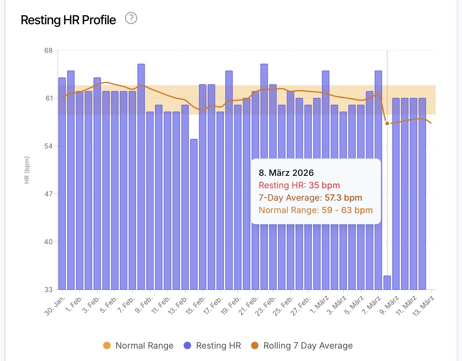 My Garmin had a problem measuring my heart rate on March 8. After restarting, it worked again. Since the values are obviously incorrect (see screenshot),