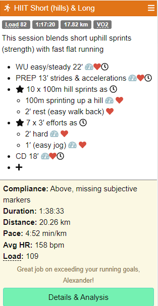 I have attached a picture of the workout and of the realized workout. I meticulously followed that training plan, and a quick napkin calculation also shows that it should be around 1h 38m and not 1h 17m.