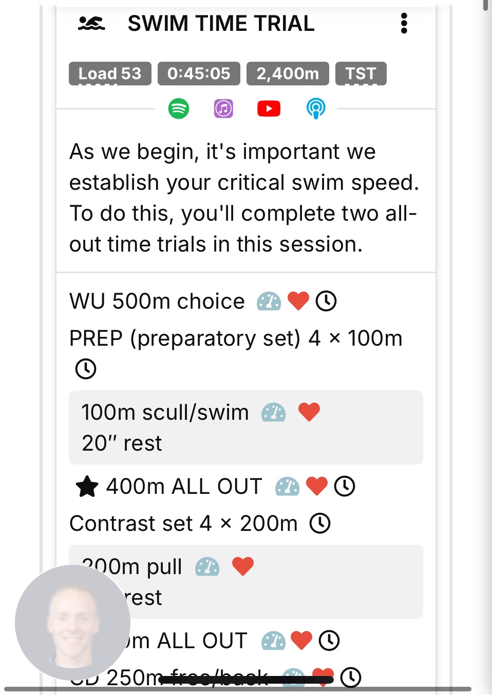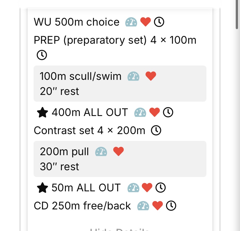 The test on Velocity has 20 min warm up instead of 30 min warm up (so just warm up 10mins prior if needed) and shorter cool down (cool down longer). The main set is still the same.