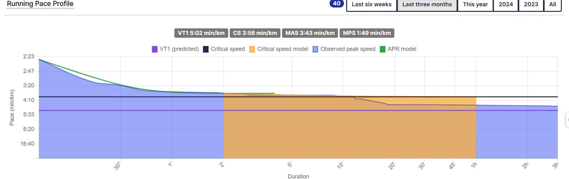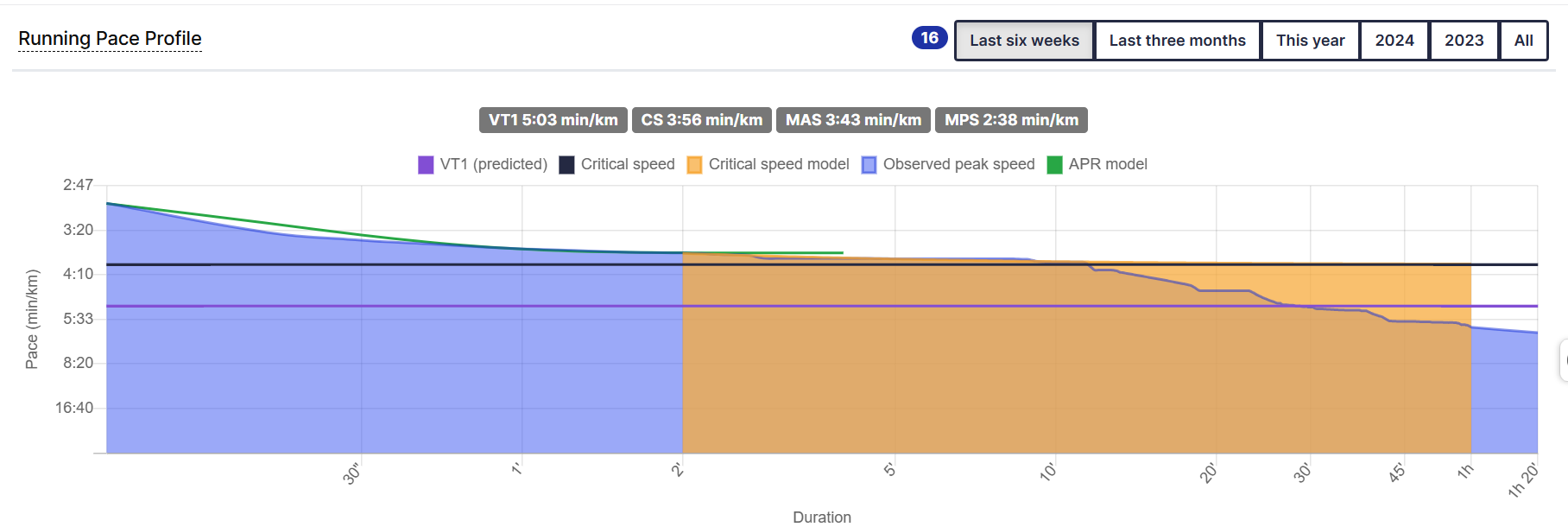 Please hover over the blue line to see which workout this run data is coming from. Check along the blue line at 30s, 2min, 5min, 10min. Are they all coming from the same workout? If so, click on that workout. Check the analysis tab. Does this data make sense to you?