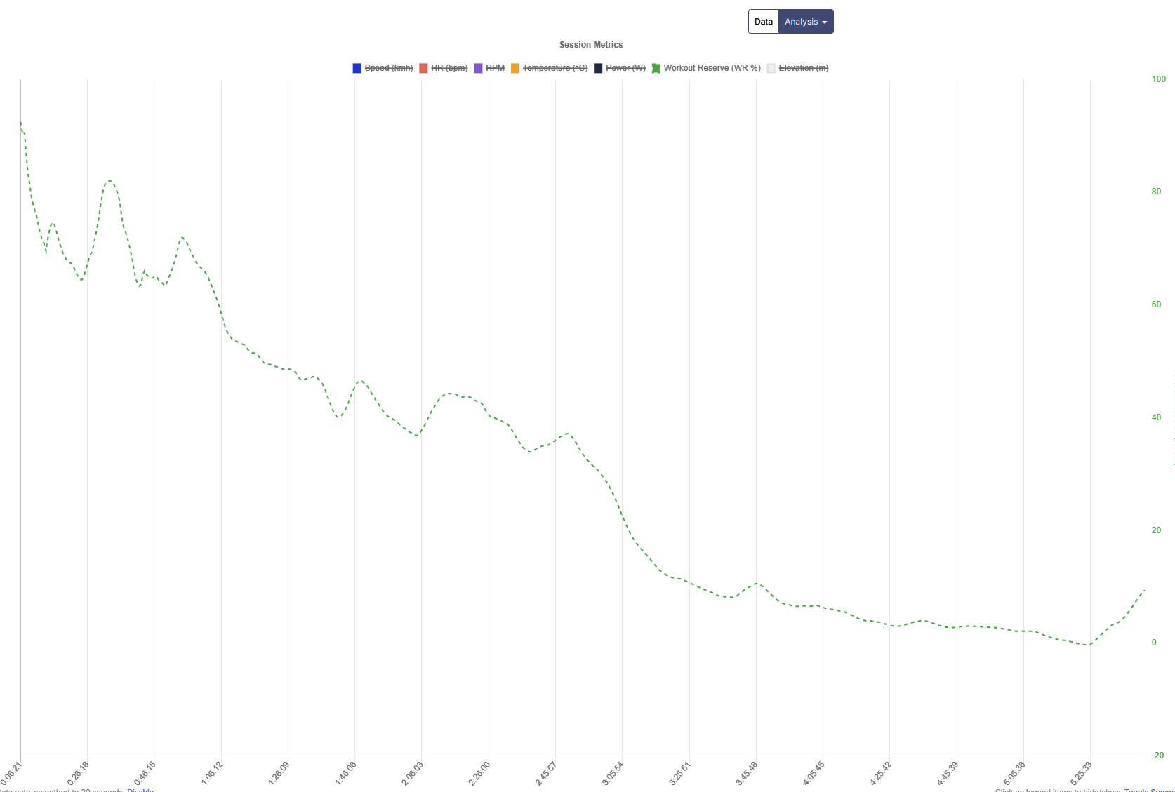 Something you may not be aware of yet is Time to Zero, which came out in the latest release at the end of 2024. Time to Zero predicts when you will reach 0% workout reserve in real time. It gives you the prediction in hours: minutes: seconds. I used it on Monday to help pace a 5.5 hour outdoor ride, where I finished at a WR of -1% at the end. My cycling power graph shows that my peak 5 hour power was achieved during this session.
