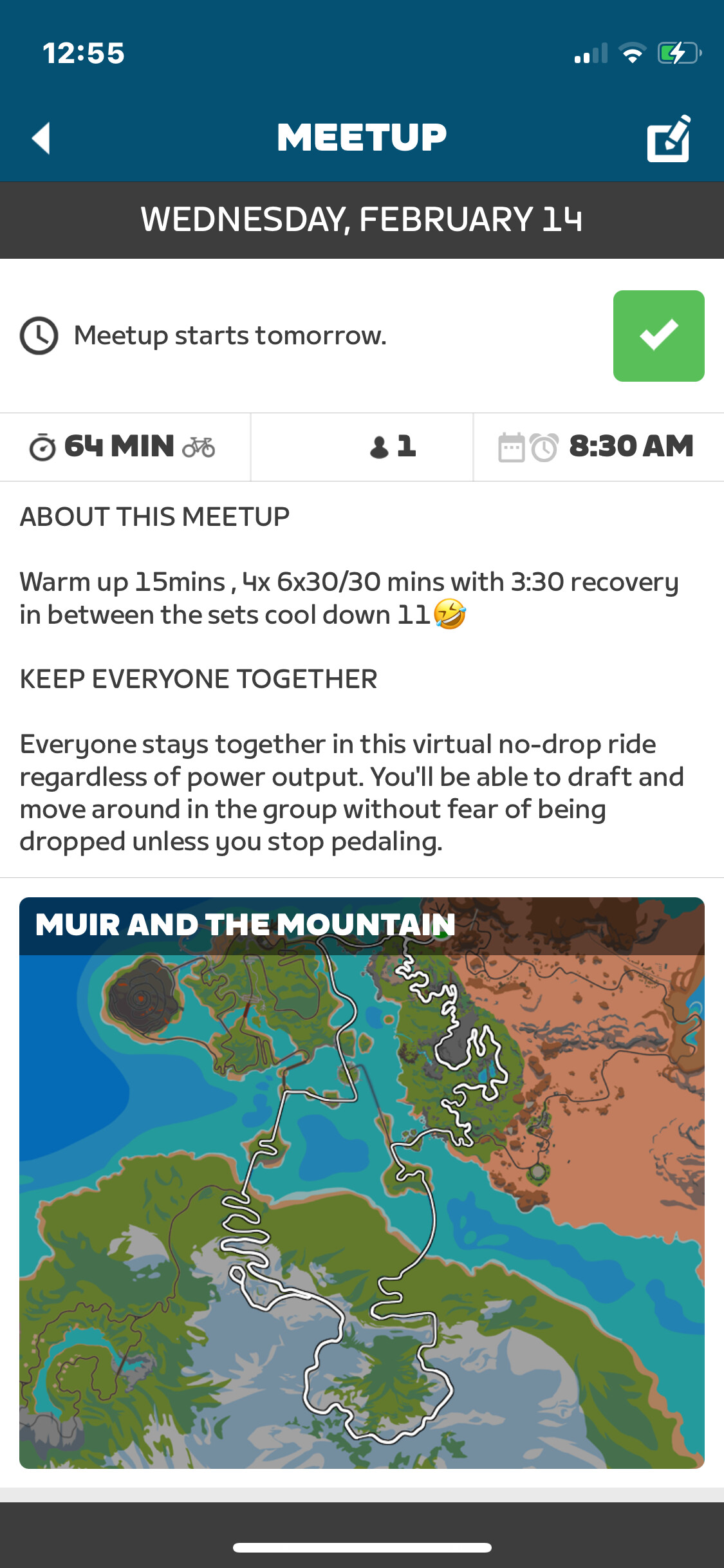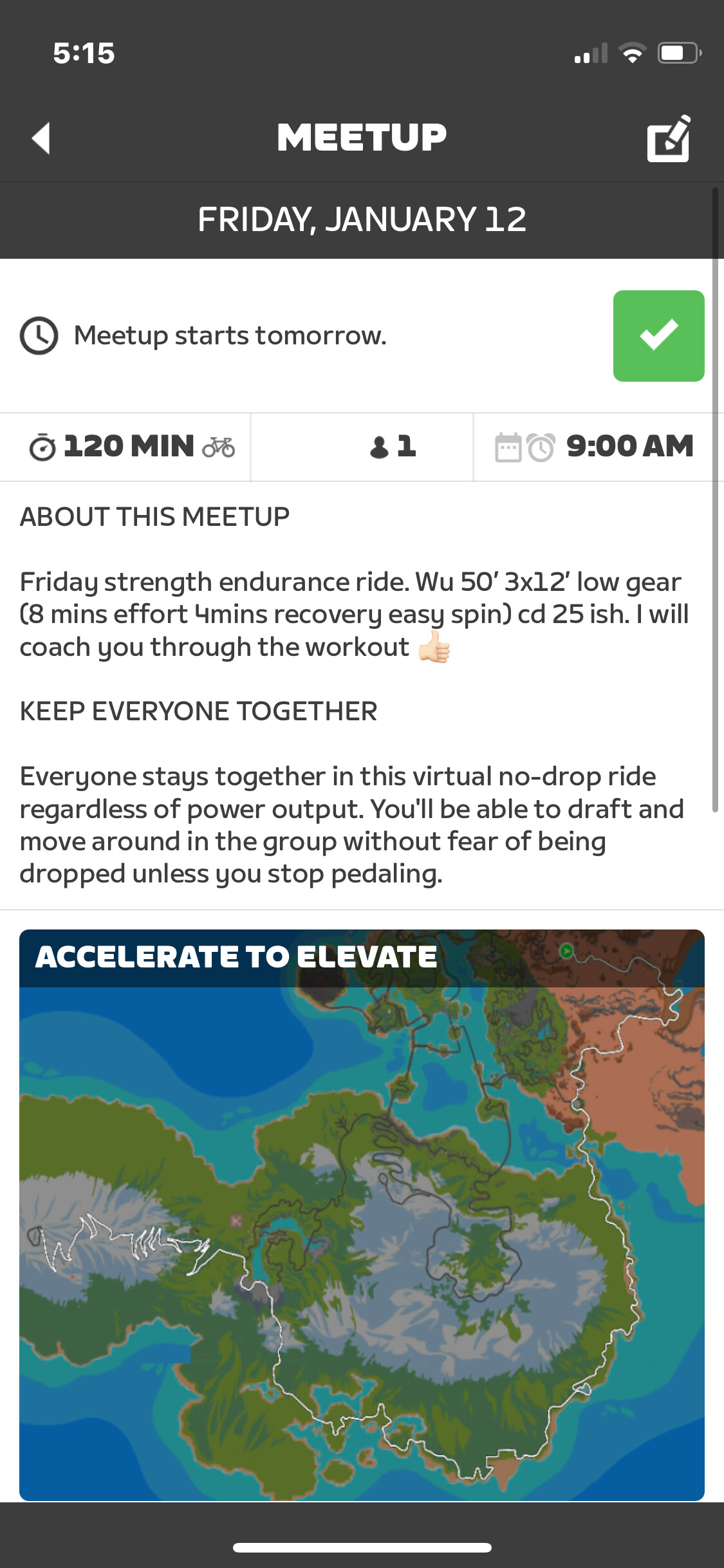 Tomorrow morning Friday 12th 9am Central US I will fire up the zwift for Strength Endurance work - roughly 2hrs. You are hereby invited to join! Please show up in time as late join is not allowed in Meetups. You don’t need to pick a workouts as I will coach you through. Join for the whole ride or just a bit, but be there 8:55 am or be left behind