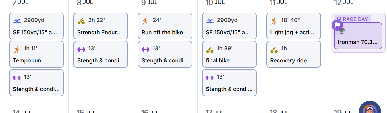 The screenshot below is what it gives me for race week of my A race. Where is the recovery? Why is there a Run off the Bike without a bike workout?