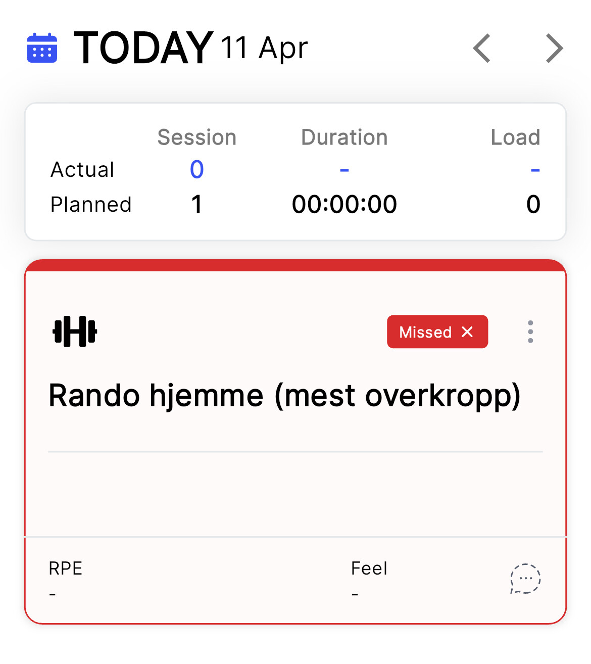 This one’s interesting. I have been feeling poorly lately but felt up to some bodyweight resistance training today. Nice weather and fairly good temp for doing it at the back patio. 40 mins. No monitoring by watch or anything, but I added manually in Garmin Connect after. Which ends up as manually added in Athletica, too - expected - but also as ‘missed’ - not expected: