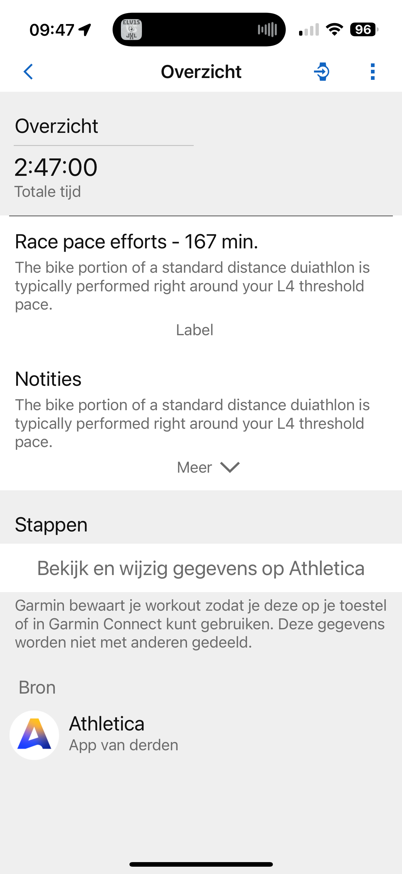 This weekend I had a run scheduled which would last about 58min. I have Athletica connected to Garmin. On my Garmin the run was imported as a 55 min run with different intervals.
