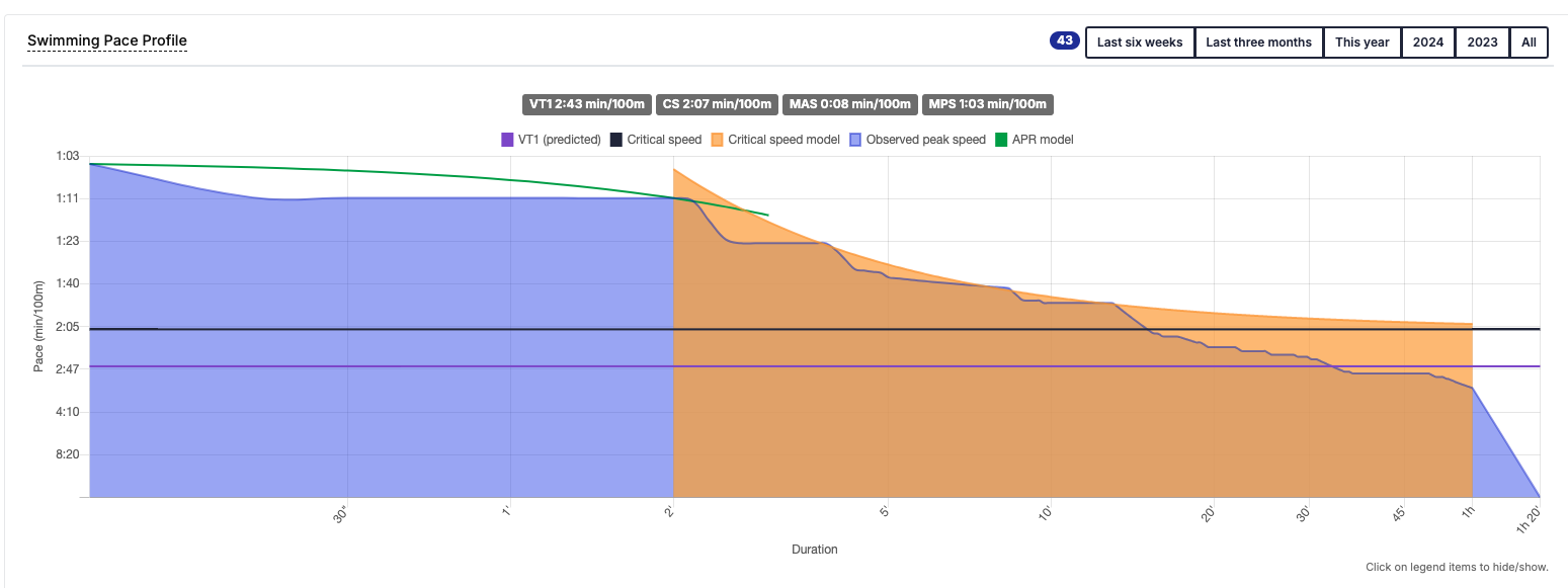 Follow the swimming pace profile’s recommendation when selecting the last six weeks, which currently displays no data. It suggests completing at least three maximal efforts in the 3-minute and 15-minute ranges (e.g., three maximal efforts at 200m, 400m, and 800m), which is different than the swimming test.