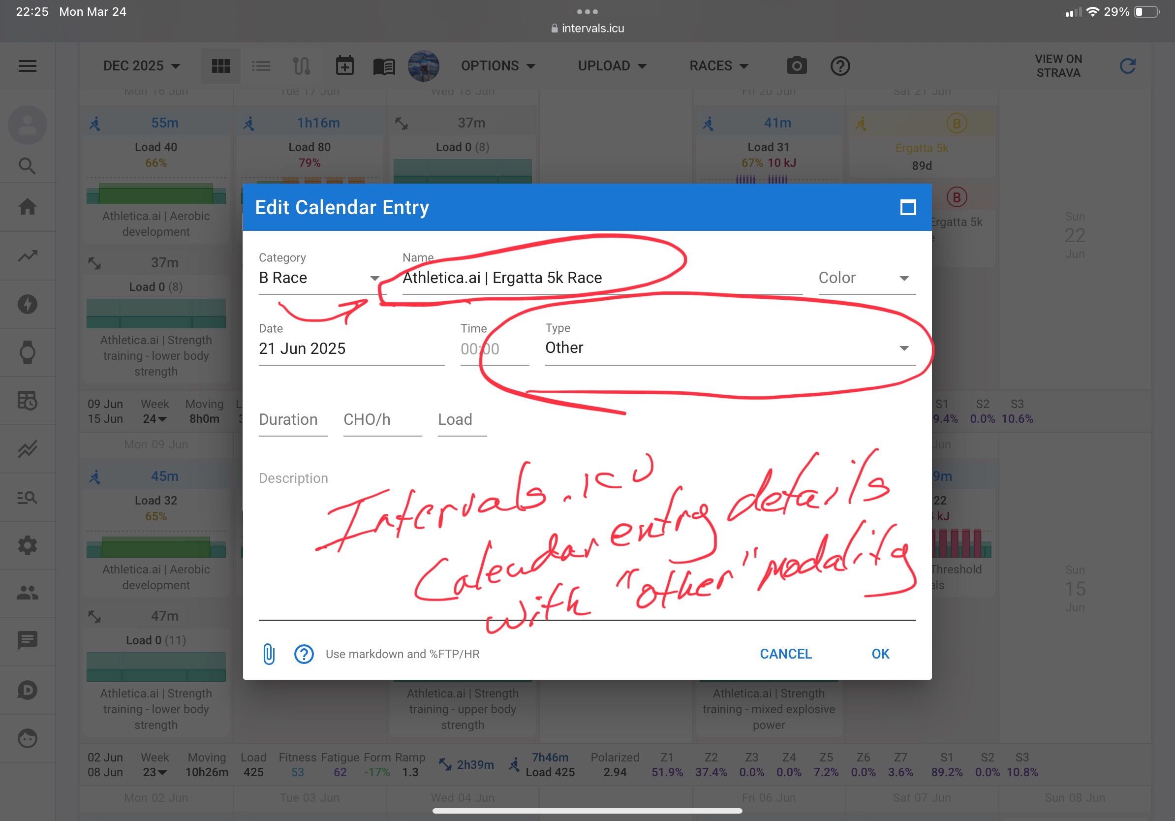 My races that I scheduled in Athletica are being written into my intervals.icu calendar as an “Other” workout type instead as a “Rowing” workout type as I classified in my Athletica Training Goals. I did notice that the modality of the race is not written in my Athletica Training Plan calendar entry, which may be a possible reason why this is not being sent to intervals.icu.
