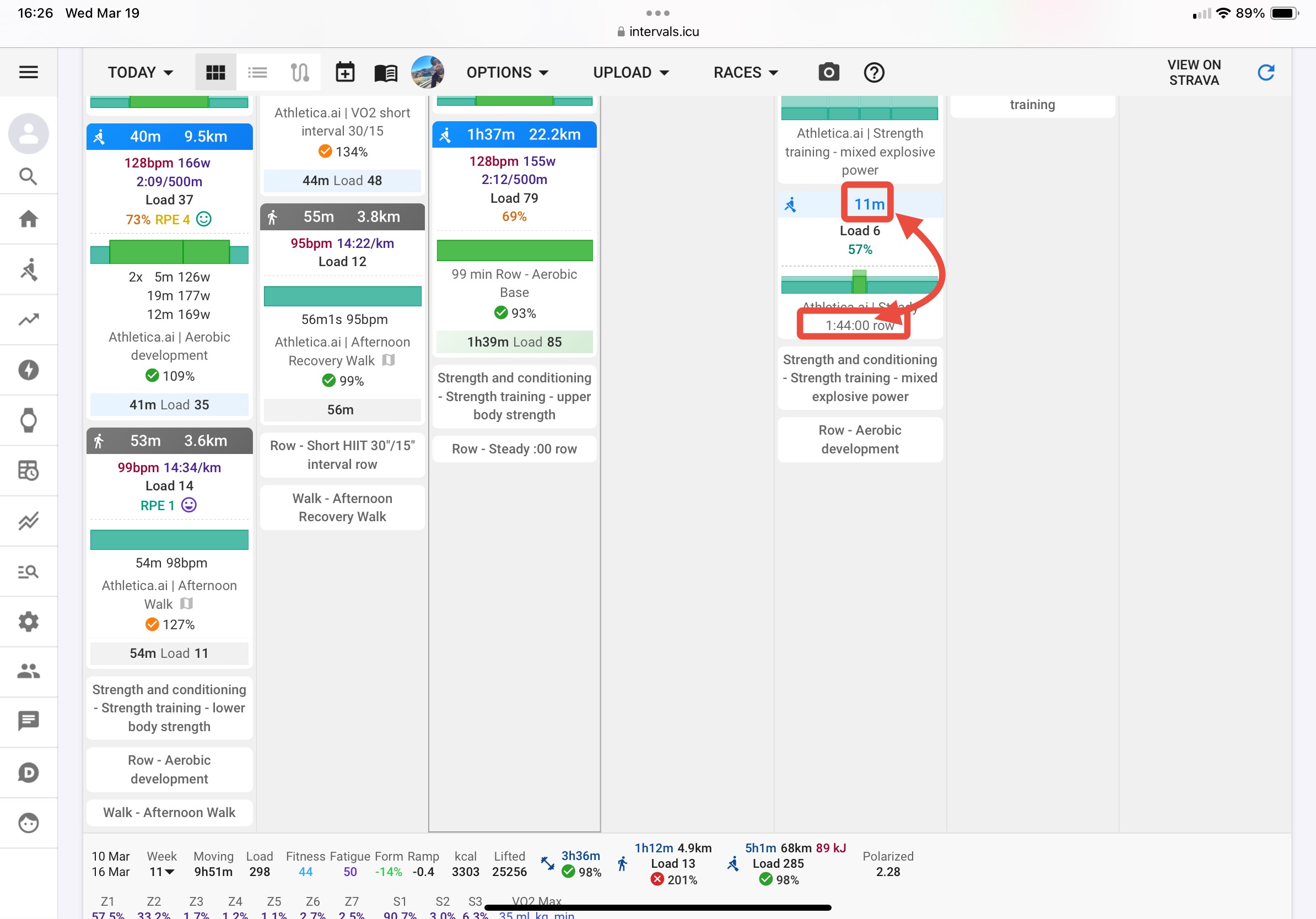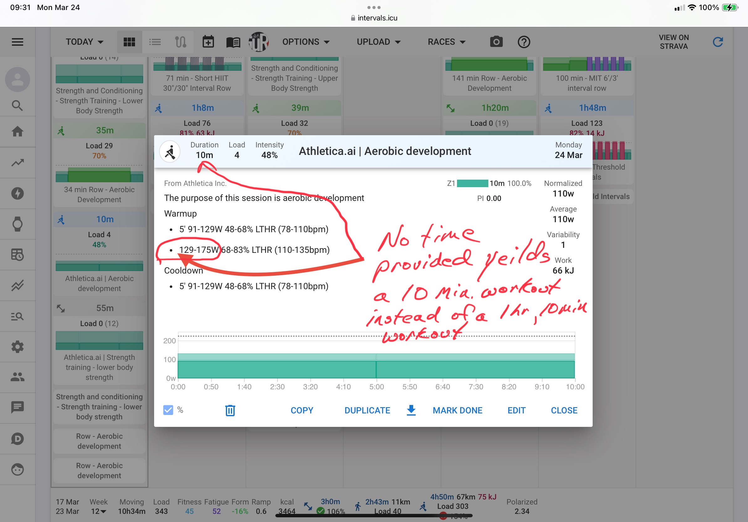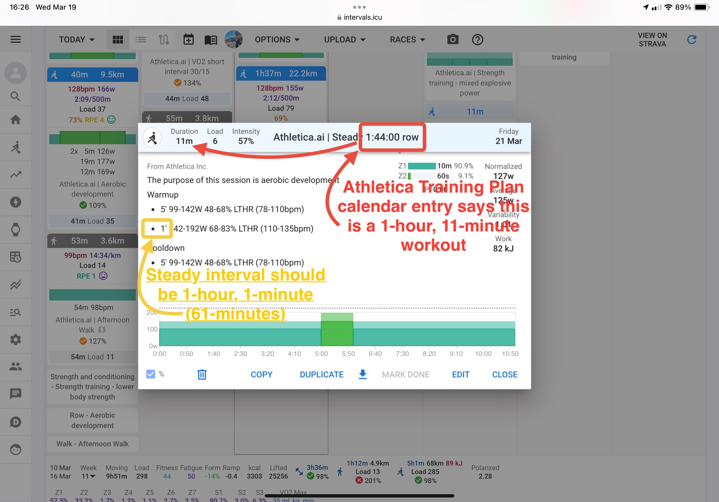 Athletica has me scheduled for a 1hr,11’ Steady Aerobic Row on Thursday. This workout was written into my intervals.icu calendar as an 11-minute Aerobic workout with 1:44:00 in the title.