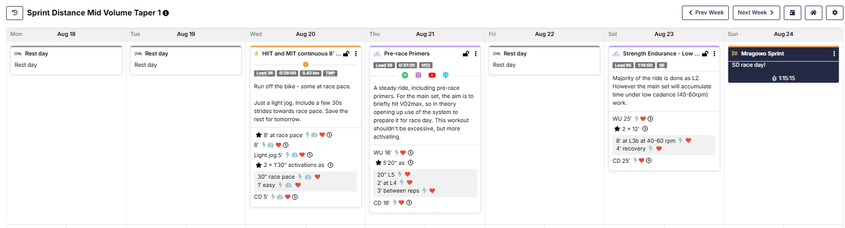 I just went through my taper week for Sprint Triathlon in 3 weeks and noticed some odd suggestions. First off Wed HIIT and MIT looks like RoB workout, asking me to run of the bike straight into race pace, than some strides, it all looks messy anyway. Secondly on Sat (day before race) it suggest strength endurance with low cadence for 1:14h which I think is too much for before the race? I presume low cadence will have effect on muscle soreness not mentioning that the 1:14 is my hit goal for the race next day