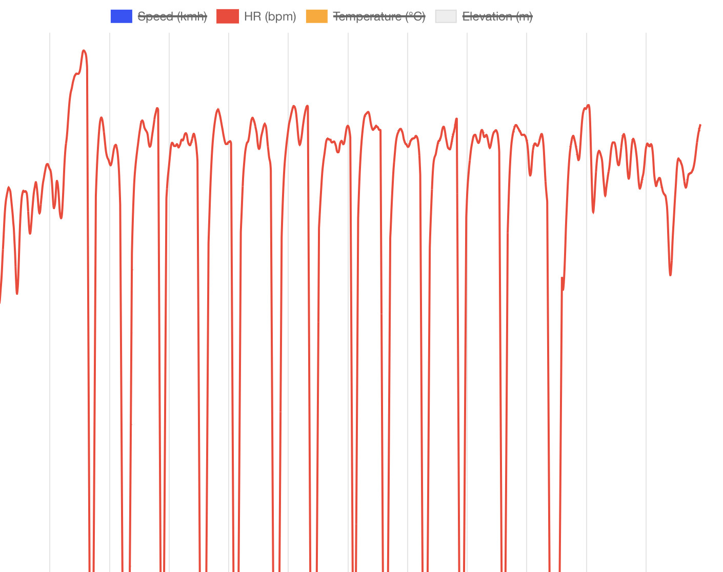 What I can say is that I can feel the cumulative fatigue in my legs. Today’s 3x6x30/30 was no easier this week than last week’s 4x7x30/30. Maybe the S&C workout on Tuesday that’s left my legs feeling sore also has something to do with it I did notice that my HR responded more quickly to changes in load during this workout. Faster rise and drop off vs last week.