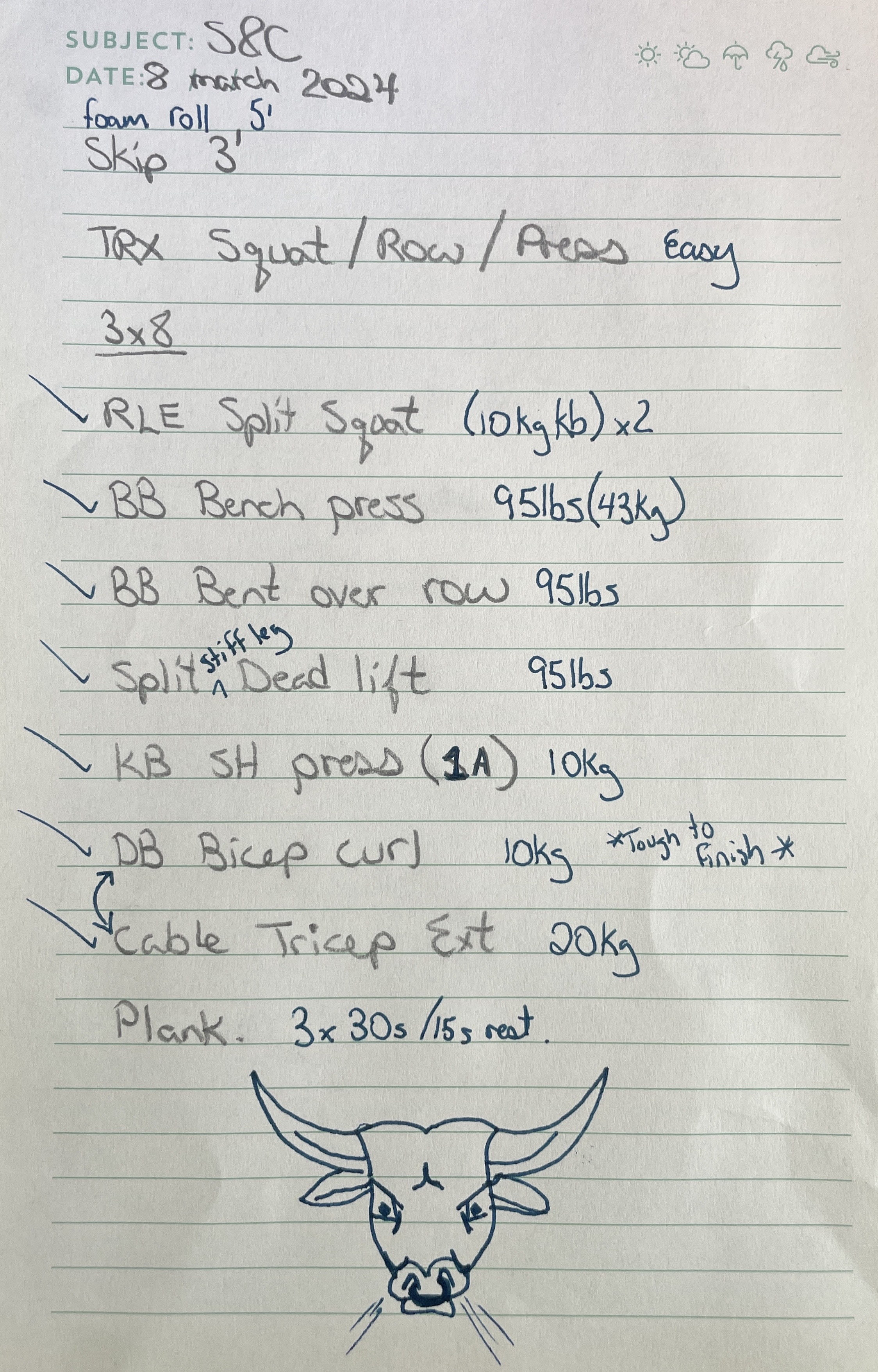 Heath metrics are excellent, RHR is lowest in a long time, 2bpm lower than 60d average and HRV is also excellent. S&C tomorrow!