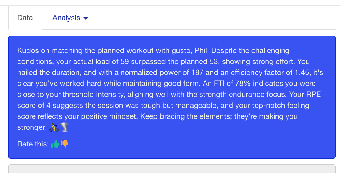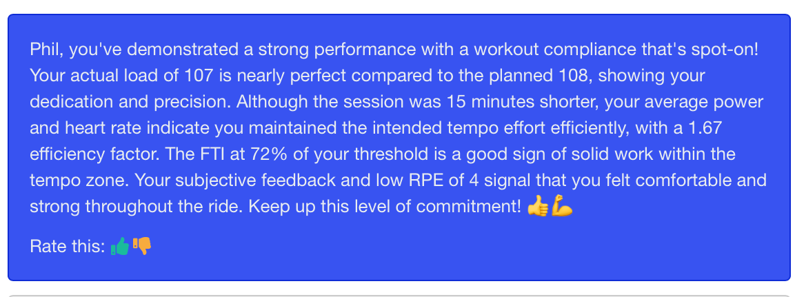 Long distance over-unders felt great, and I surpassed what I thought I could run off the bike with 4K at 5:17min/km pace (a bit too hot to hold for full marathon I think). AI Coach was happy.