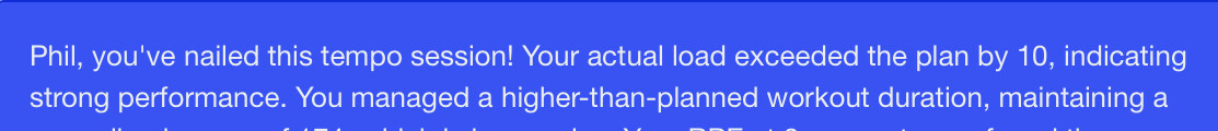 My wife has had the Lurgi and her first outing on my long rides in a month. Went a bit easier than AI wanted. Told the AI coach why. It’s doubled my tempo intervals tomorrow to keep me on plan, but that’s all good.