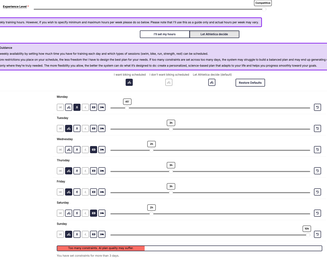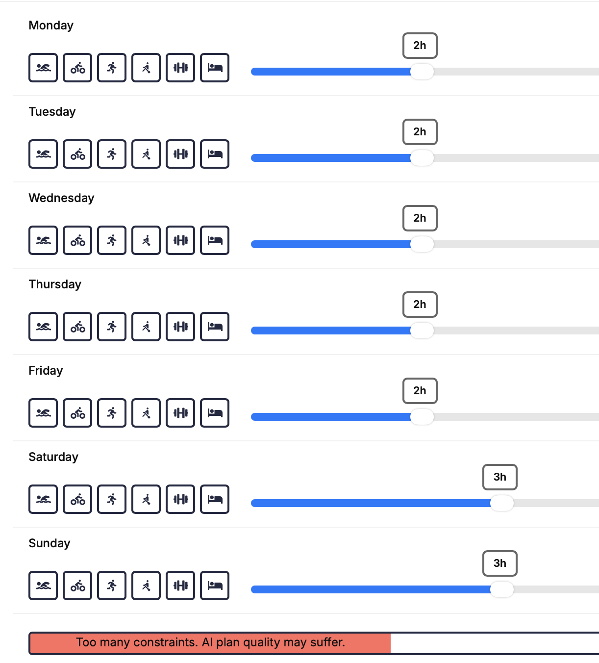 I have specified a minimum of 4 hours and a maximum of 8 hours in my training plan but adjusting my available hours to a reasonable level to support those hours gives me an error?