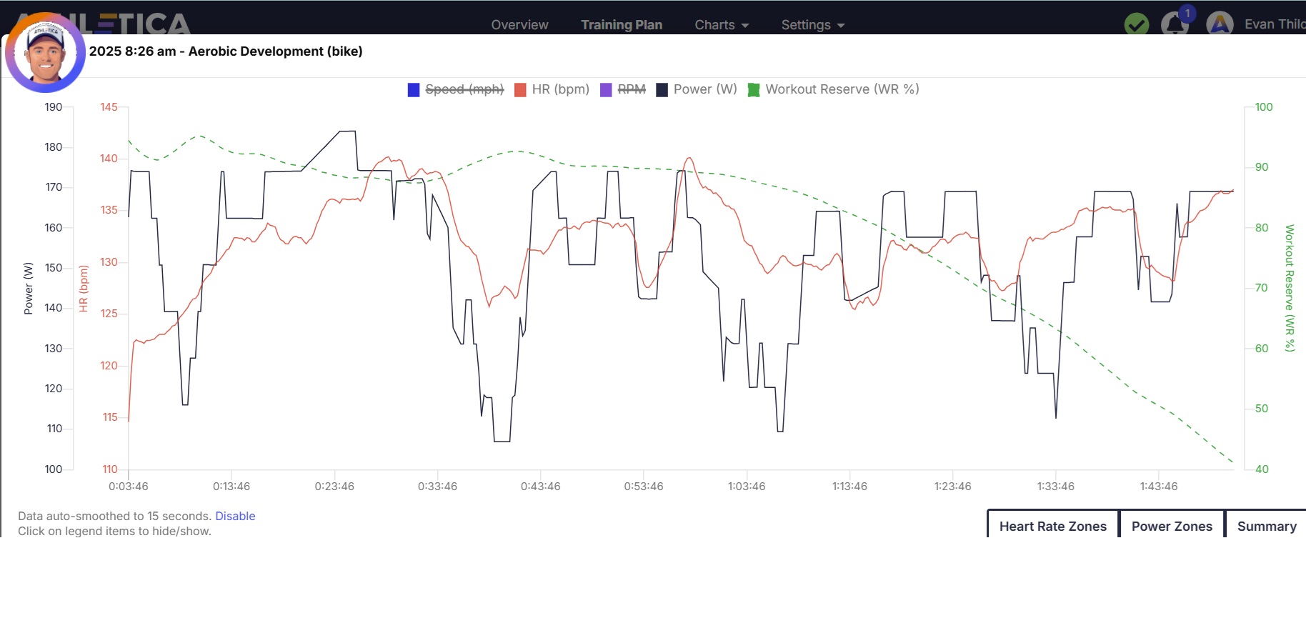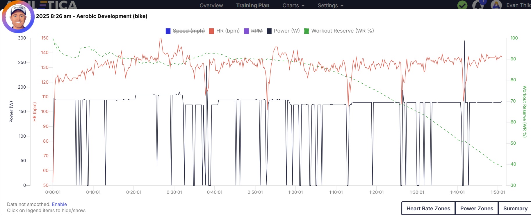 Plan was a 1h50m zone 2 aerobic development ride on the trainer. I held a power on ERG mode anywhere between 165-185W, never went below 165W save for short breaks to take lactate tests.