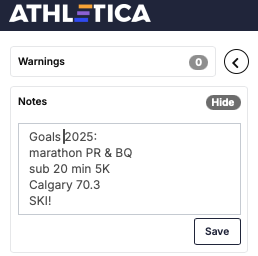 For me, I’d quite like to have multiple notes each tied to a particular day or week so that I could see what (non-training) events constrained my activity on a given day or week. It would simplify reflection on a week’s activity without poring through each activity. Examples would be “I was travelling quite a bit this week for domestic issues, and had limited access to the bike and trainer”, or “I had a mild cold for the first half of this week”. The presence of notes could be indicated by an icon on the week view.